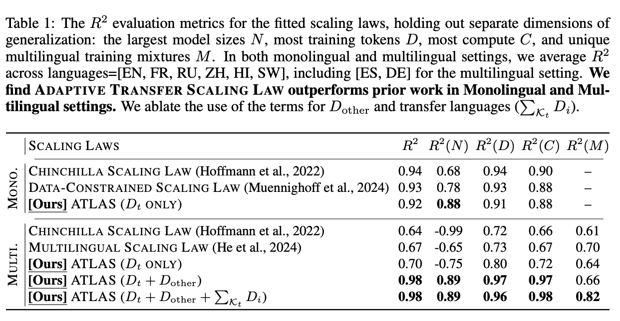 モノリンガル(単言語)およびマルチリンガル(多言語)事前学習の両方に対応する適応型転移スケーリング則(ATLAS: ADAPTIVE TRANSFER SCALING LAW)を導入し、多言語モデルにおける言語間の関係性を分析、以下の事実を明らかにした。
