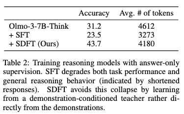 - 実世界の状況に合わせてThinkingのデータが得られない場合に、Thinkingデータなしで学習させた場合にどうなるかを実験。SDFTの方が(おそらく)元の思考能力を失っていないので高精度