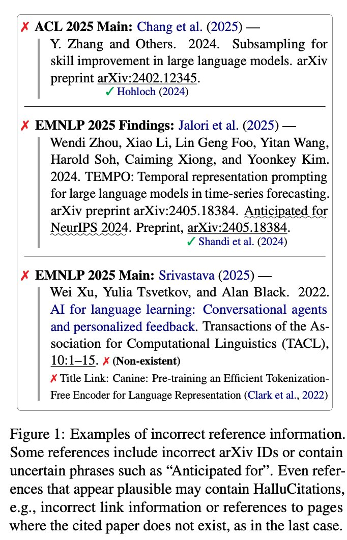 論文中の誤った引用が急増していることを示す論文。2024,5年のNLP系のトップカンファレンスの論文17,000件以上を対象に調査したところ300件ほどの "HalluCitation" が含まれる論文が検出された。