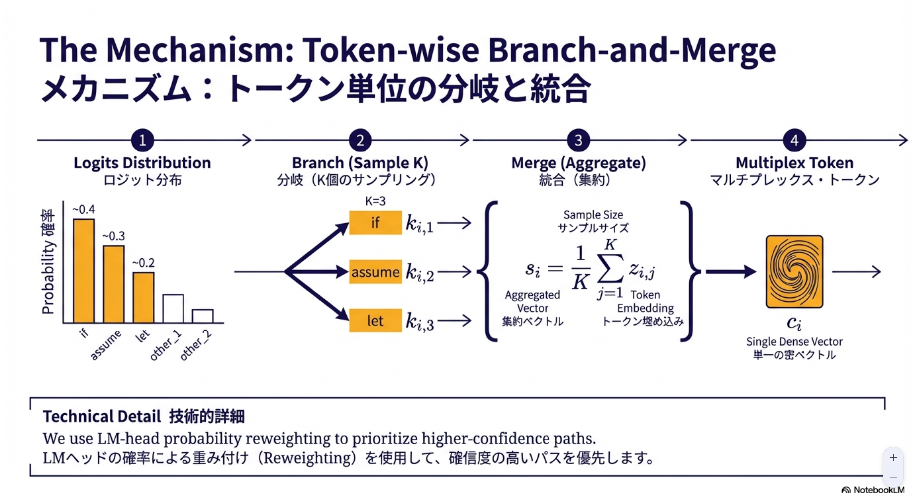 - Thinking中は、サンプリングしたトークンを次の入力とするのではなく、確率分布を単一の埋め込みベクトルに圧縮したものを入力とする