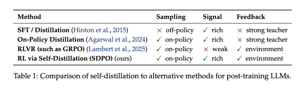 - 通常の蒸留手法は強力な外部モデルを教師とするが、SDPOは「フィードバックを見た自分自身」を教師とする