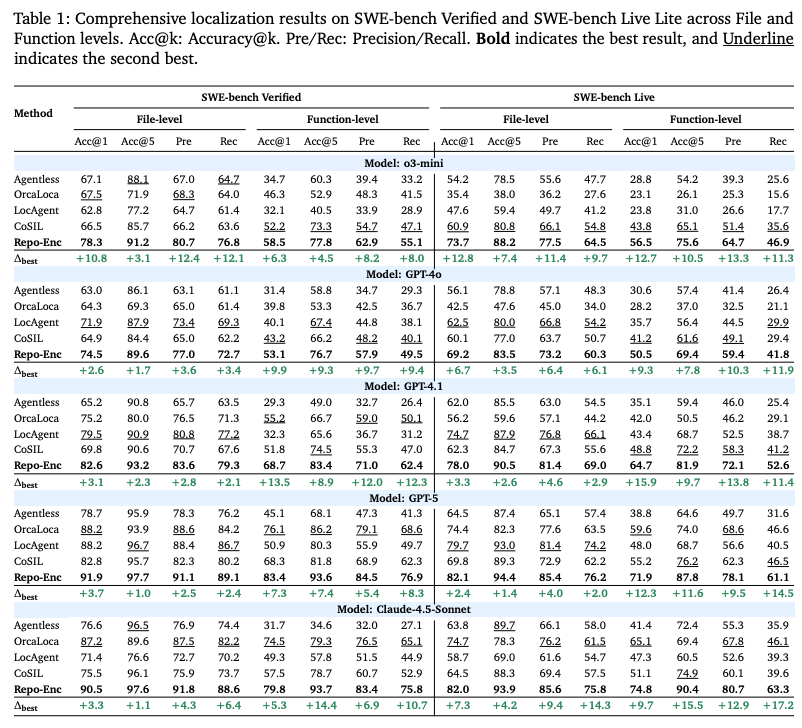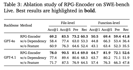 - SWE-bench Verifiedにおいて、RPG-Encoderは関数レベルのAcc@5で93.7%を達成。
