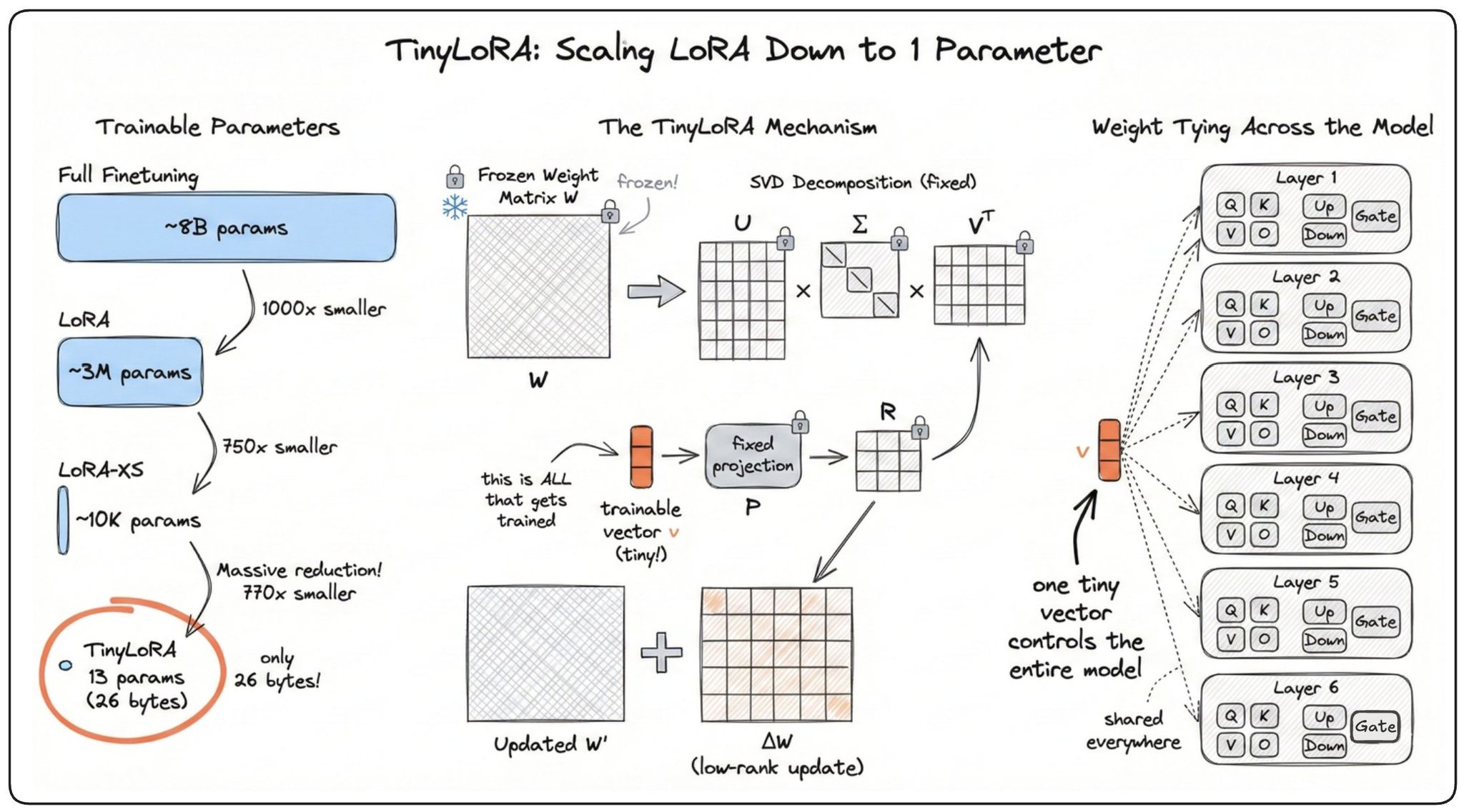TinyLoRAは、LoRAおよびLoRA-XSをさらに拡張し、わずか1パラメータにまでスケーリング可能にする手法です。