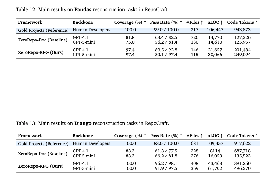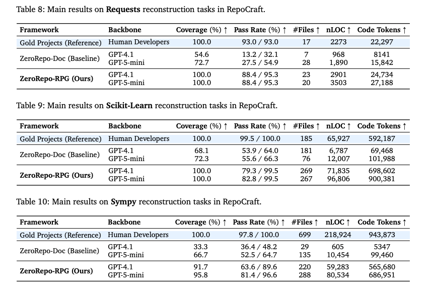 - 目的: RPGがどれだけ元のリポジトリの情報を保持しているか(Fidelity)の検証。既存ライブラリ(Scikit-LearnやDjango等)をゼロから再実装。