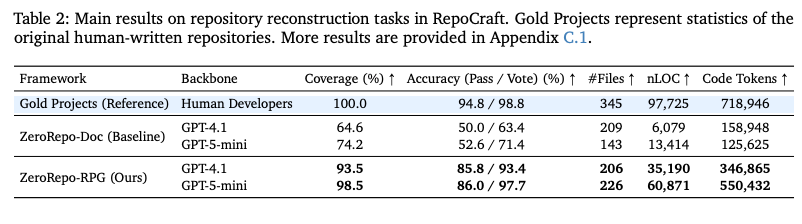- カバレッジ: 元のリポジトリに存在する公開API(クラス、関数、メソッド)のうち、生成されたリポジトリに正しく実装されたものの割合。RepoCraftベンチマークにおいて、RPGを用いた再構築は98.5%を達成。