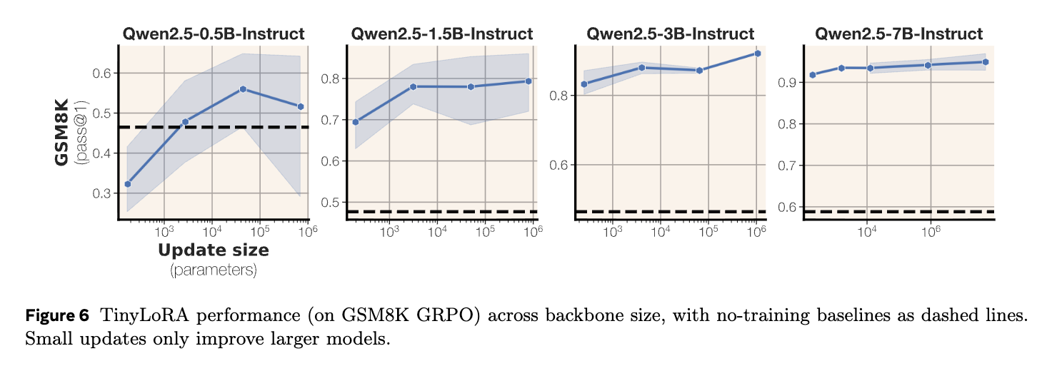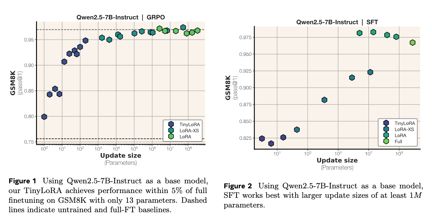- 例えば、Qwen2.5-7B-InstructモデルをGSM8Kでファインチューニングする際、TinyLoRAとGRPOを組み合わせることで、わずか13個のパラメータ(bf16で26バイト)で91%の精度を達成しています。これは、同じパフォーマンスレベルに達するためにSFTが必要とする更新サイズよりも100〜1000倍小さいもの。