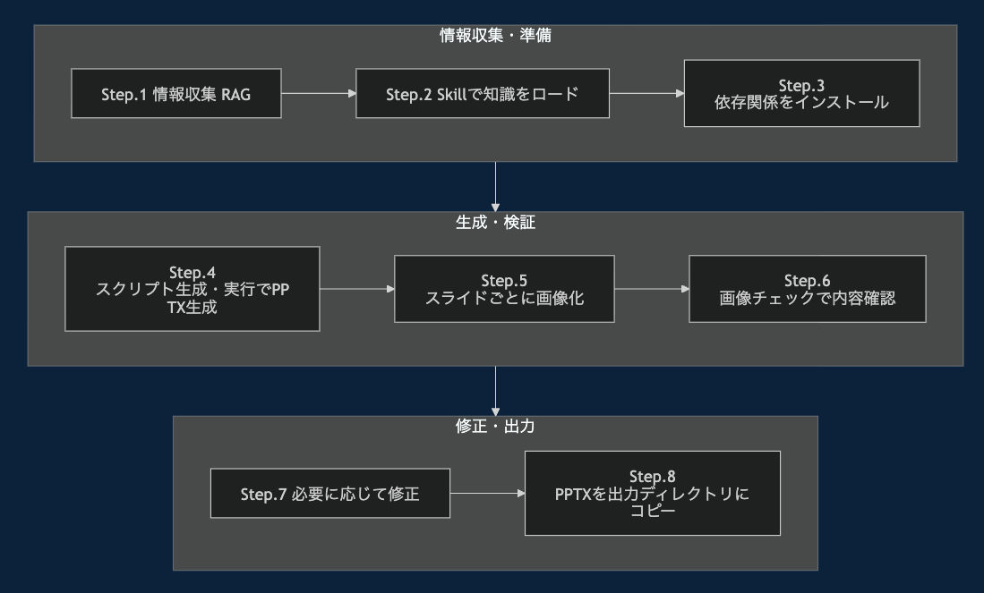 Claude SKILLSで必要なライブラリをインスコ、その後PPTX生成用のNode.jsスクリプトを生成&実行