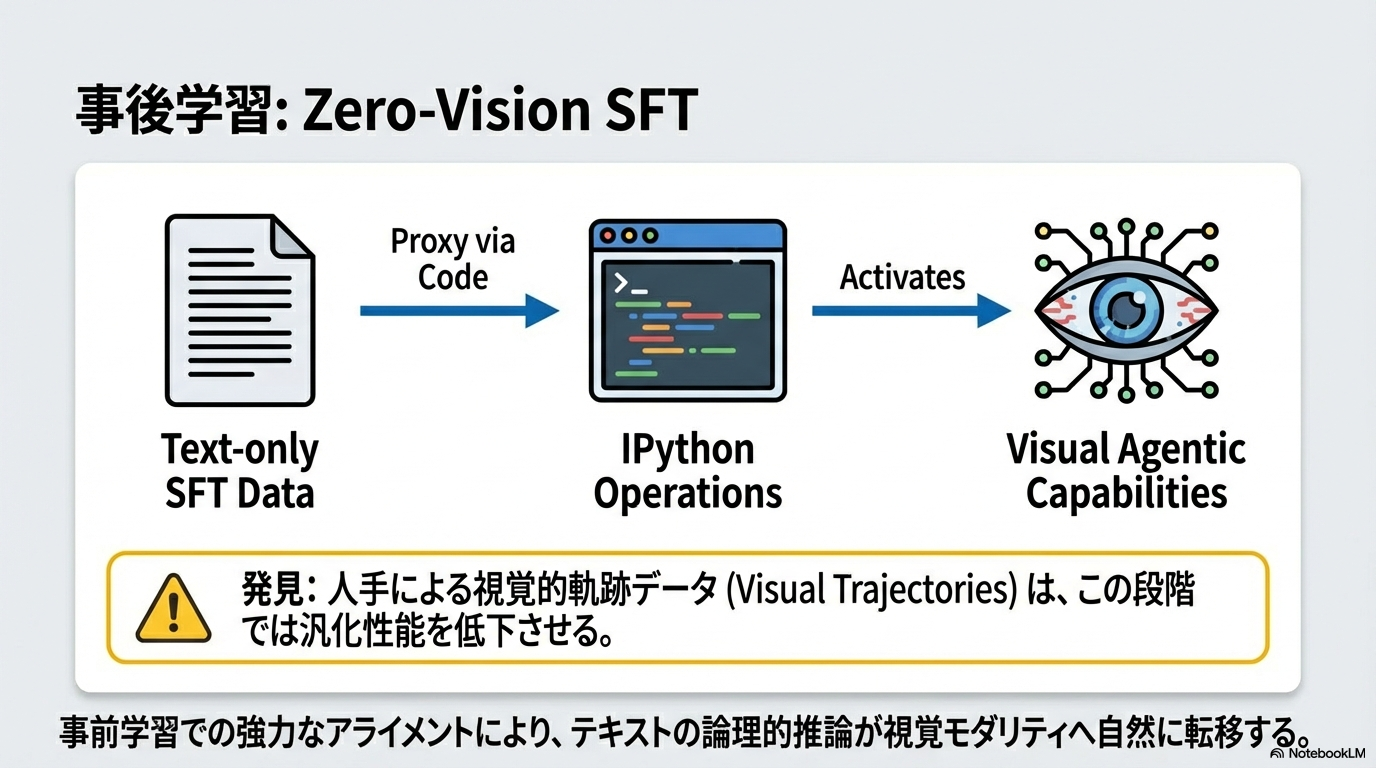 - Zero-Vision SFTでコードを記述できるようになったものを、ちゃんと使いこなせるようにするイメージ