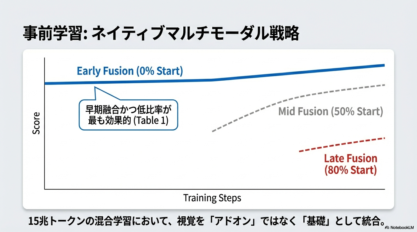 - 従来のpre trainingは学習終盤にVisionを結合させていたが、pre trainingの初期段階から低い比率でVisionを少しだけ統合することで安定したマルチモーダルパフォーマンスが得られた