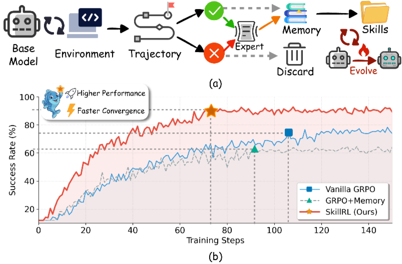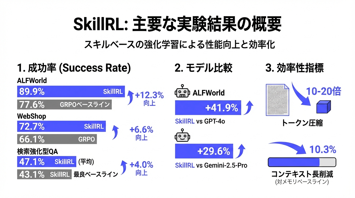 - SkillRLという、自動的なスキル発見と再帰的進化を通じて、生の経験とポリシー改善のギャップを埋めるフレームワークを提案。