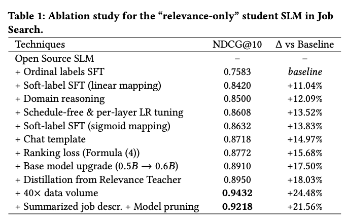 - Multi-Teacher Distillation: - 関連性教師: 8Bパラメータのオラクルモデル(0-4の段階的関連性スコア) - エンゲージメント教師: 1.7Bモデル(クリック・応募・却下などの複数目的) - 重み付きKLダイバージェンス損失で学生モデルに知識を統合