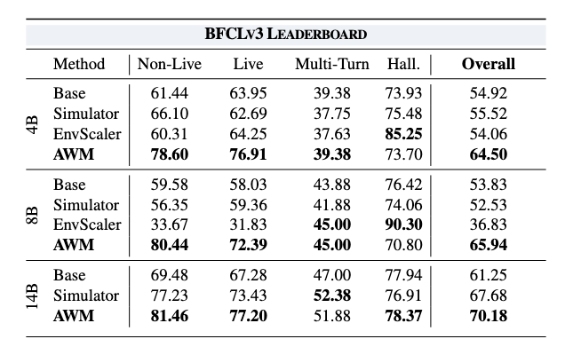 - AWM環境でRLしたエージェントは、RLなし(Base)のモデルやLLMシミュレータで学習したモデル(Simulator)でと比較して分布外の汎化性能向上が確認された