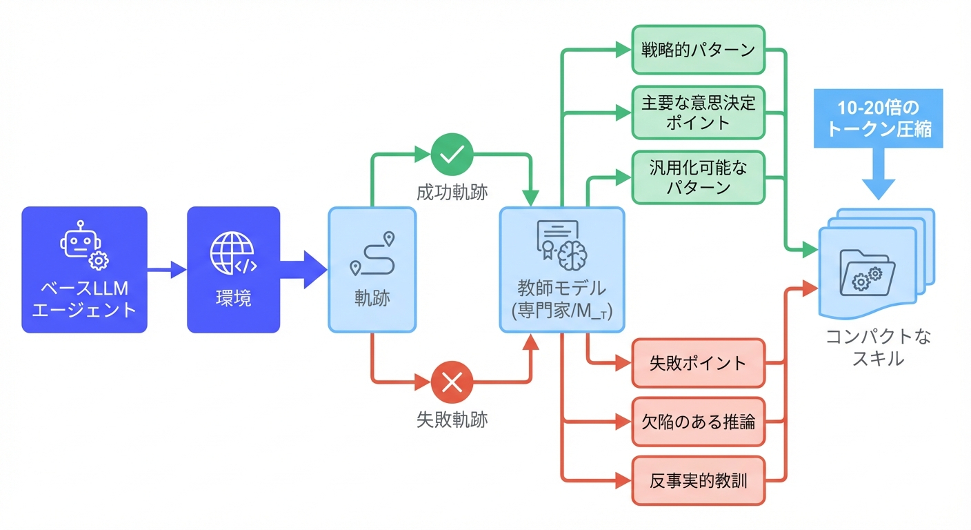 - 生の軌跡は冗長であり、探索的行動、バックトラッキング、冗長なステップが含まれる。SkillRLは、教師モデルを使用して、軌跡をコンパクトで再利用可能なスキルに蒸留する。