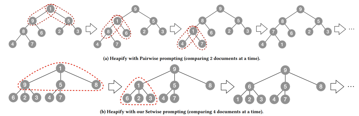 セットワイズ法ではⅽ個のアイテムをまとめて比較。これはLLM は 2 個のアイテムを比較もc個のアイテムの比較も一度の呼び出しででき、そのコストはあまり変わらないため有効