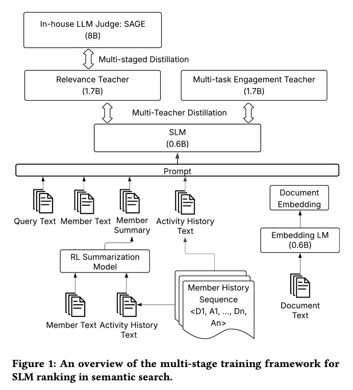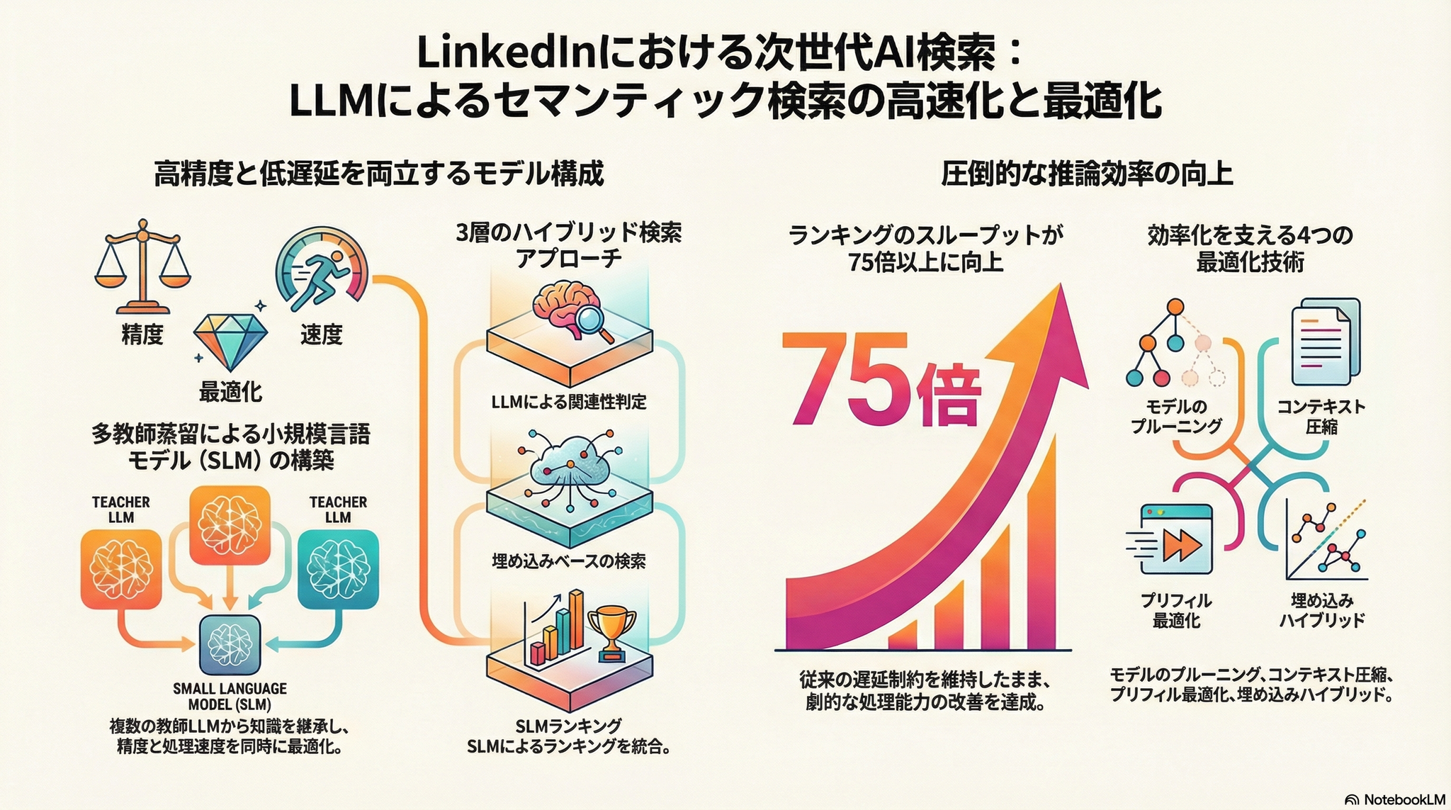 LinkedInの求人検索(Job Search)と人物検索(PeopleSearch)において、大規模言語モデル(LLM)を本番環境に導入したセマンティック検索フレームワークの全体設計を報告した論文。LLMによる関連性判定(RelevanceJudge)、エンベディングベース検索(Embedding-Based Retrieval; EBR)、そして多教師蒸留(Multi-Teacher Distillation; MTD)で訓練した0.6Bパラメータの小型言語モデル(SmallLanguage Model; SLM)を組み合わせ、固定レイテンシ下で 75倍のスループット向上 を達成しつつ、教師モデルに近いNDCGを維持している。