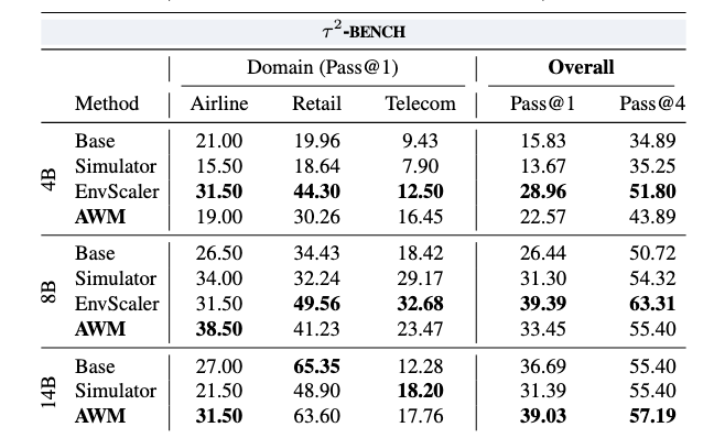 [kuto] ただしtau2 bench↓はEnvScaler(SQL DBを持たないPythonによる合成環境)に負け気味。合成環境の作り方や多様性に改善の余地があることの示唆となっている