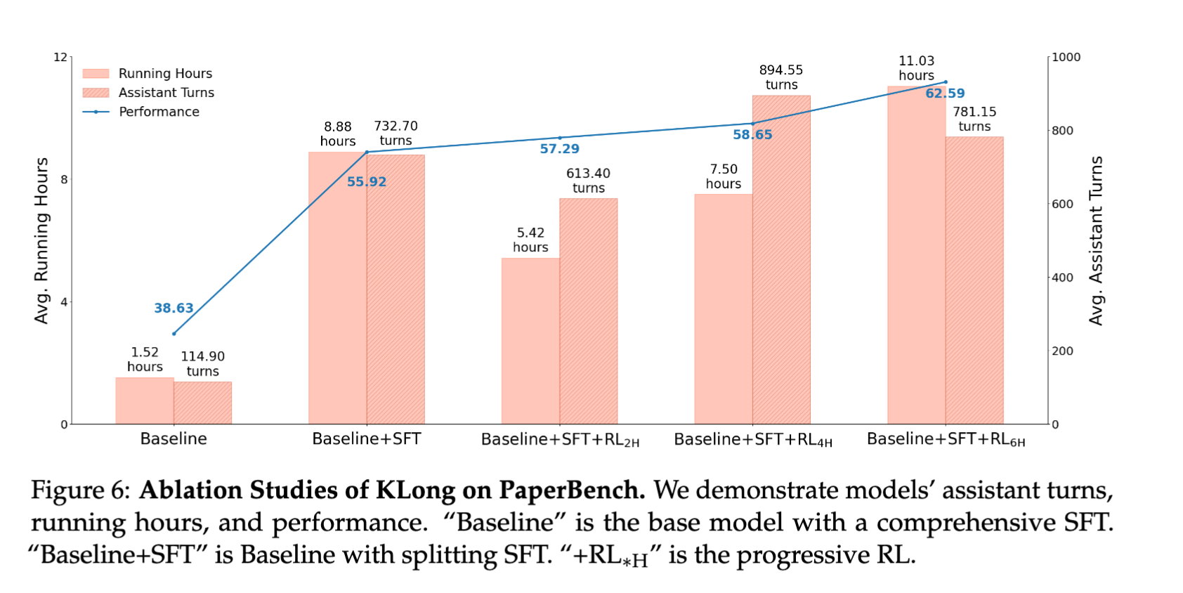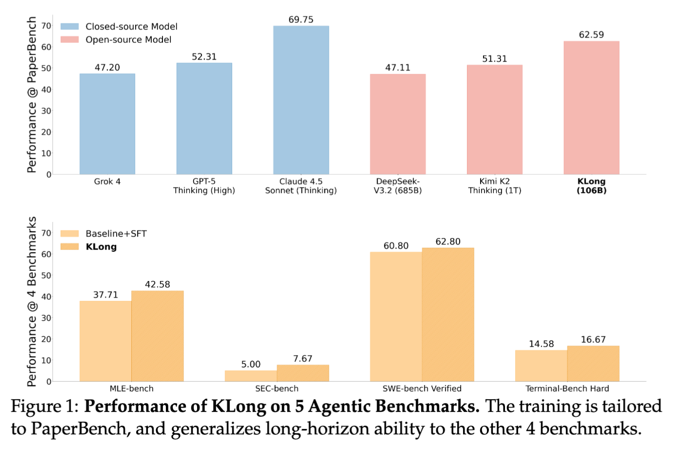 - PaperBenchにおいてKLongは平均スコア62.59を記録し、オープンソースモデルの中で最高性能を達成した