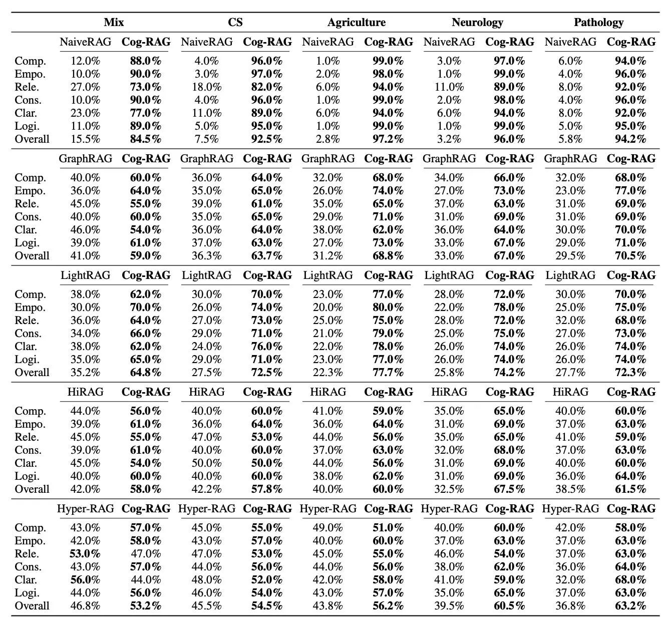 Cog-RAGは、GraphRAGやLightRAG、Hyper-RAGといった既存の最先端手法と比較して、多様なデータセット(医療、コンピュータサイエンス、農業など)や複数のLLMにおいて、包括性・関連性・論理性などのあらゆる評価基準で大幅に優れたパフォーマンスを達成。