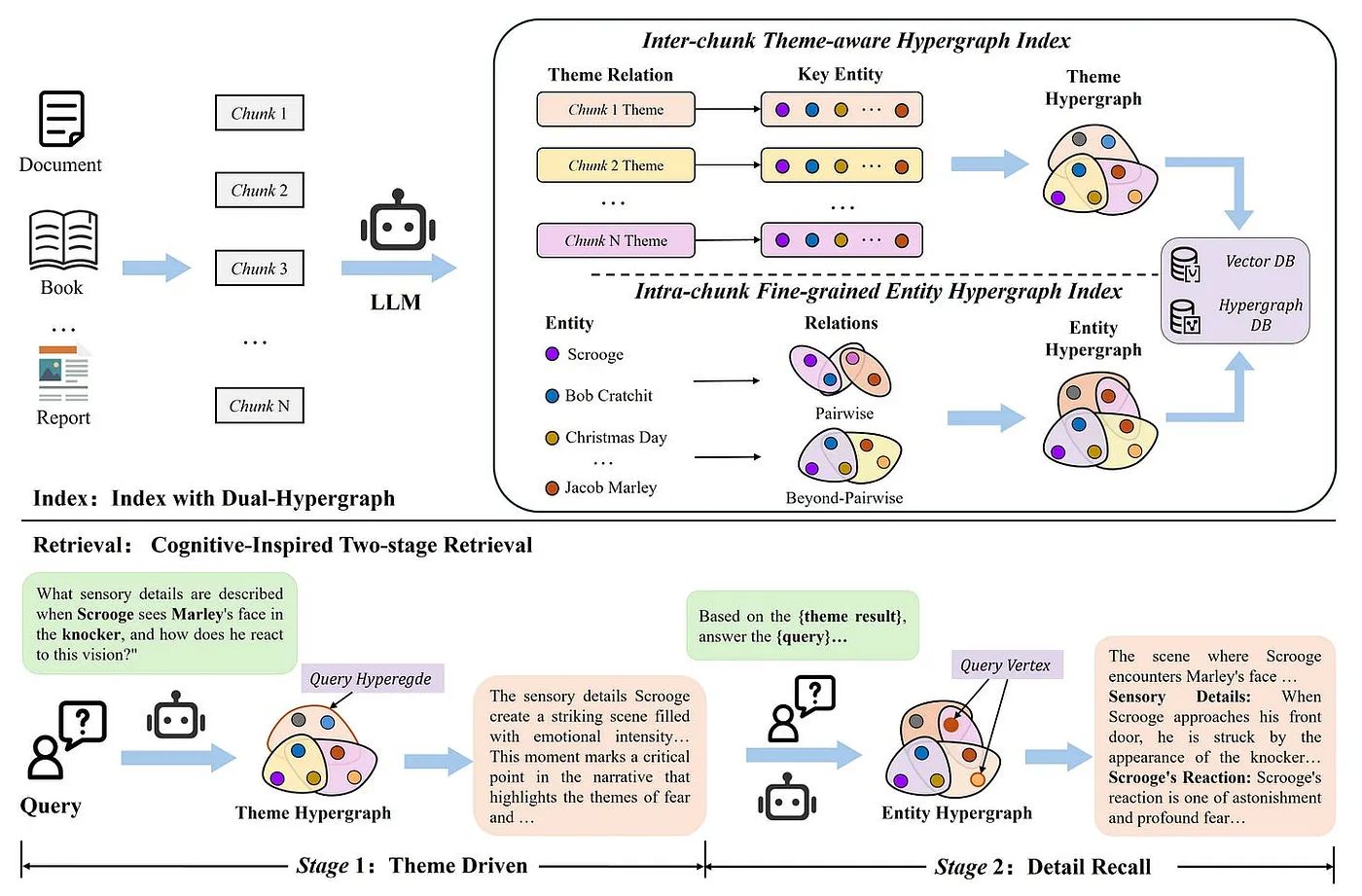 - 第1段階(テーマ主導): まず、ユーザーのクエリに関連するテーマを「テーマハイパーグラフ」から検索し、全体的な文脈の拠り所(アンカー)として機能。