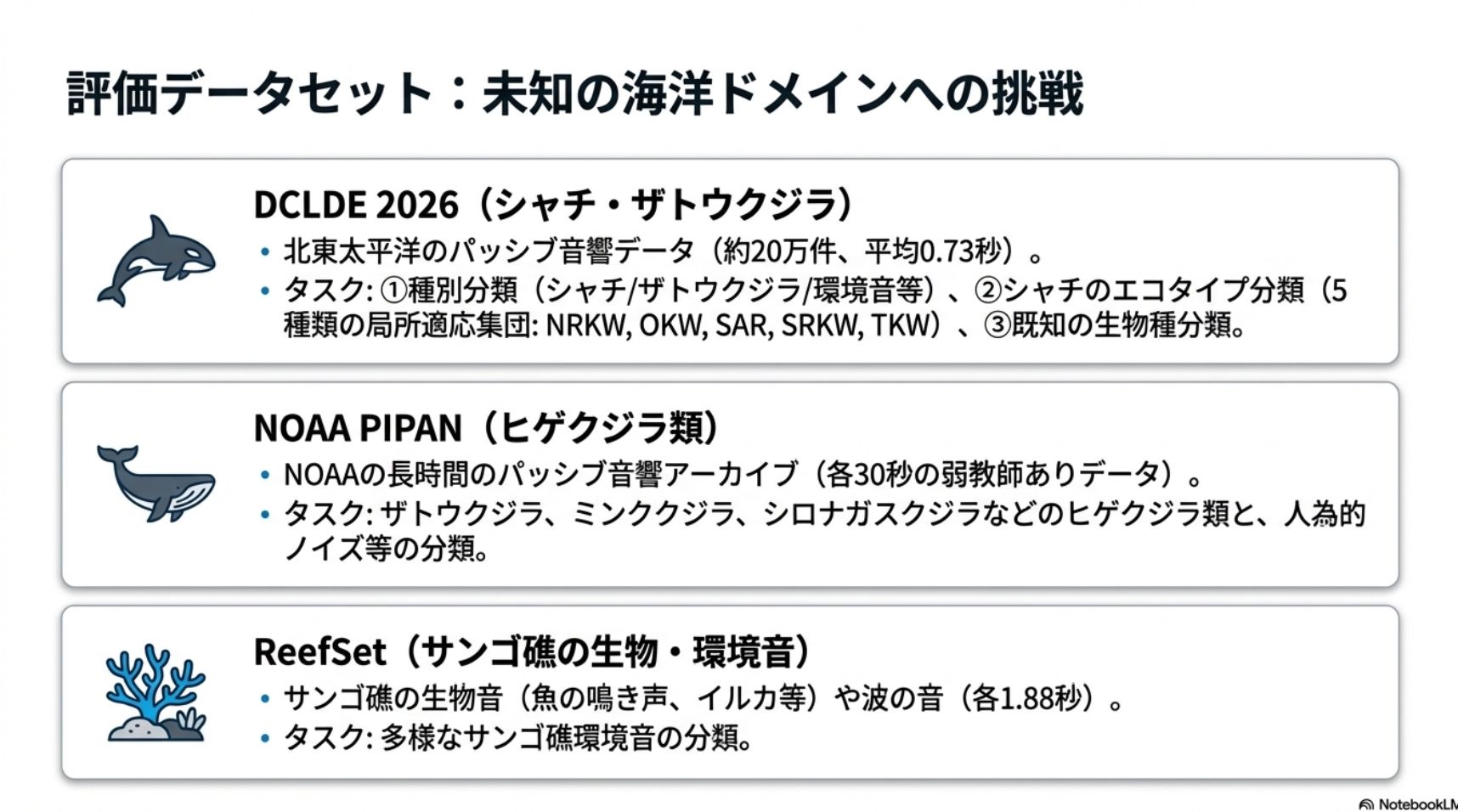 - 海洋生物の音響データは収集コストが高いので、データがたくさんある鳥類などの陸上生物で学習した基盤モデルでなんとかしたいよね。