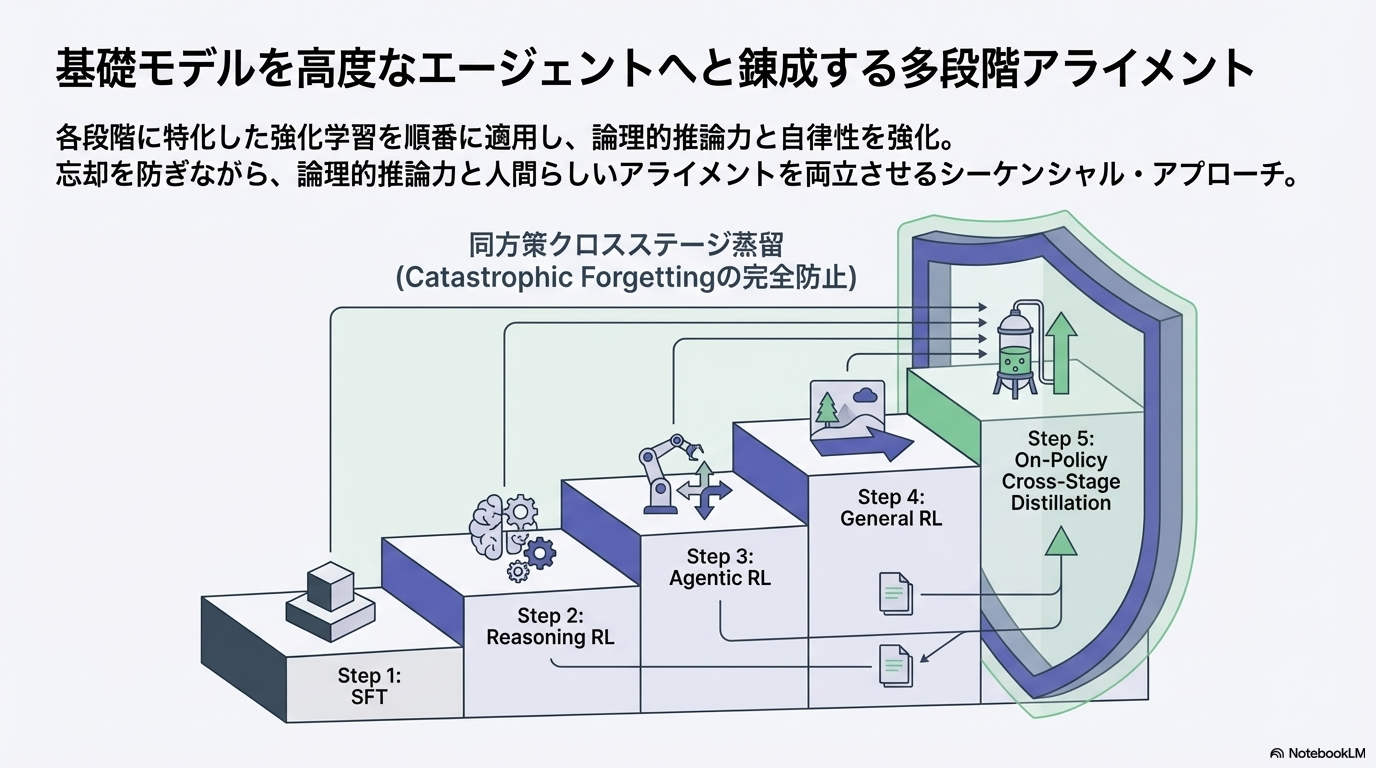- Reasoning RL → Agentic RL → General RLと段階的に学習すると、以前のステージで獲得した能力が劣化(Catastrophic Forgetting) してしまう