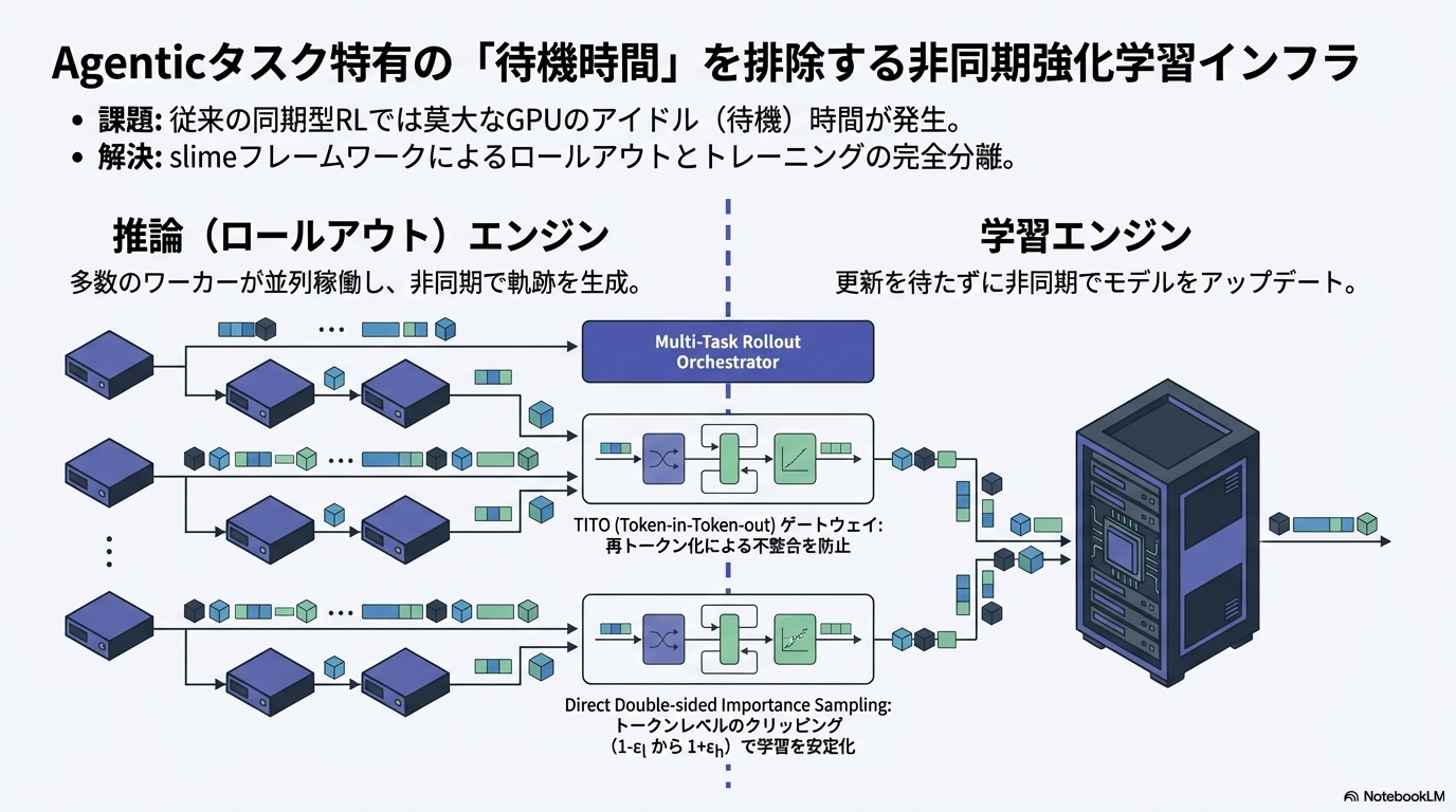 - エージェントのロールアウトは非常に長く、同期型RL(学習エンジンとロールアウトエンジンを同期)ではGPUがアイドル状態になりやすい
