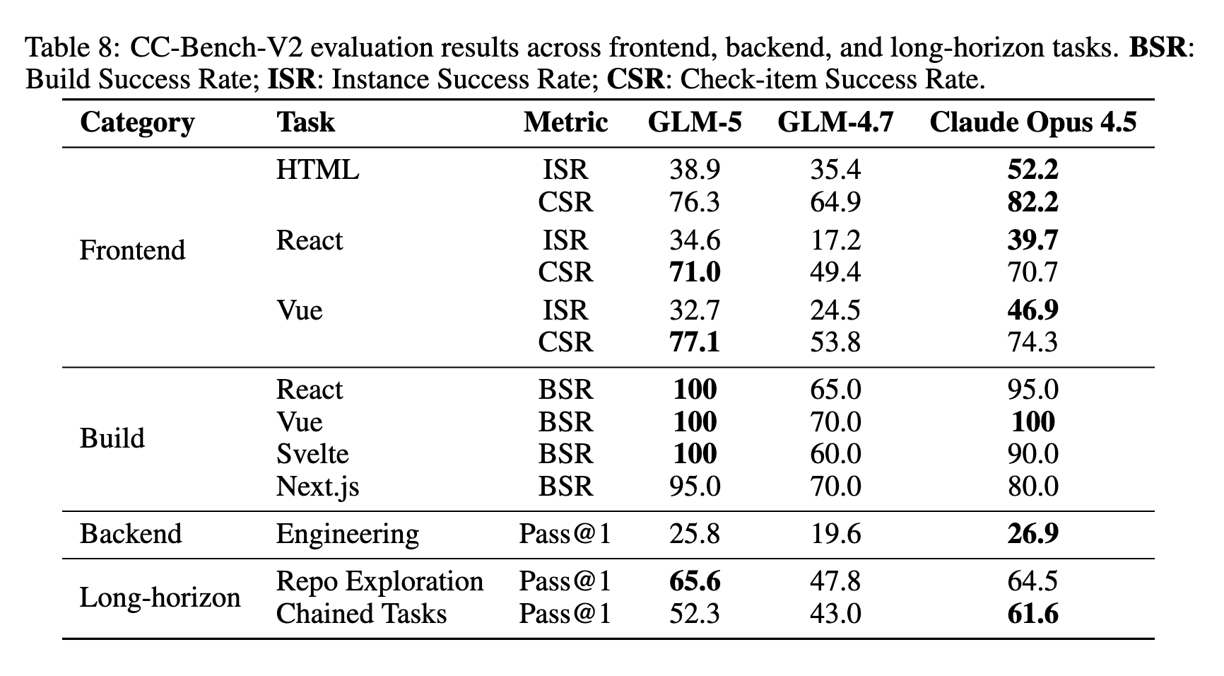- Frontend ISR(HTML 38.9、React 34.6、Vue 32.7)ではClaude Opus 4.5に対して有意な差が残存