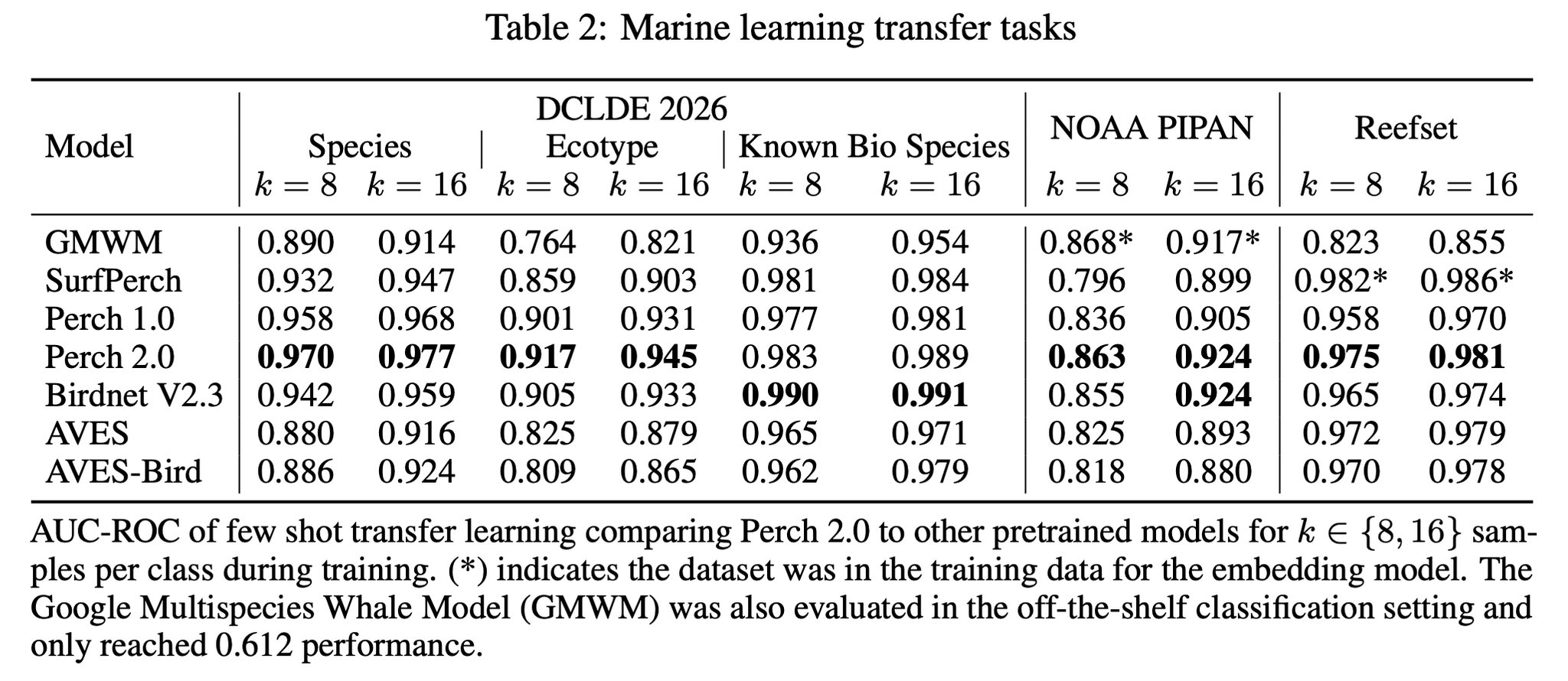 - くじら特化の Google multispecies whale model(GMWM) とくじらデータセットの NAAA PIPAN の組み合わせや、サンゴ + 鳥類データで学習した SurfPerch とサンゴデータセットのReefSetの組み合わせなどでいい勝負(しかもこれら特化モデルはリークしている)