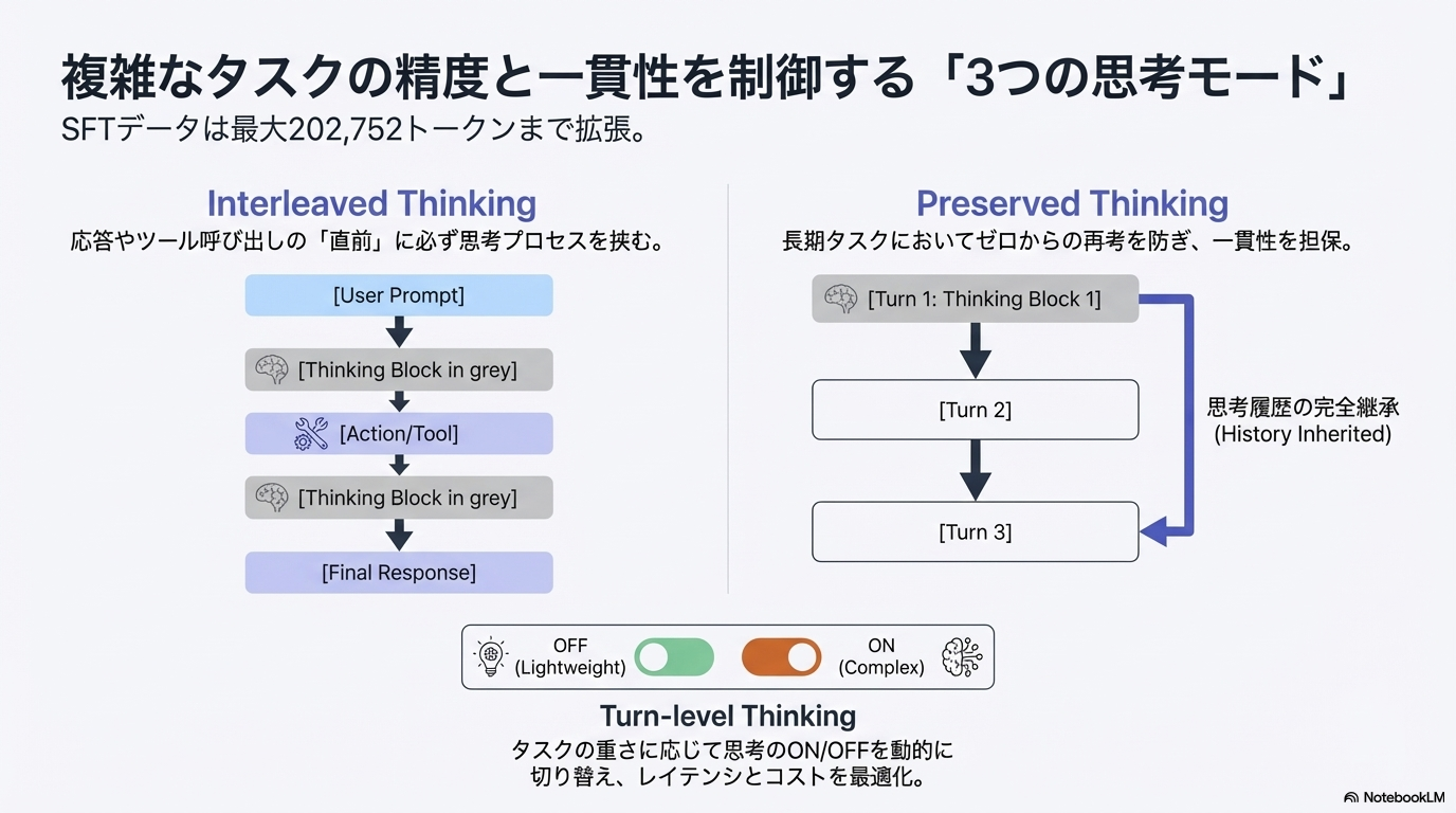 - (おそらくGLM-4.7で)複数の検証可能な環境上で、下記の思考を実施するようにプロンプトを設定して成功事例の軌跡を収集している