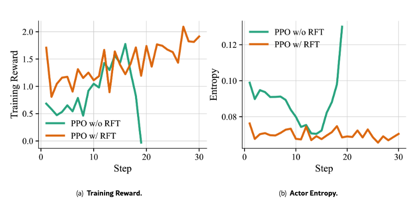 - Figure 4: RFTを外すとtraining rewardが崩壊し、同時にactor entropyが急上昇する → 探索の制御が崩れている