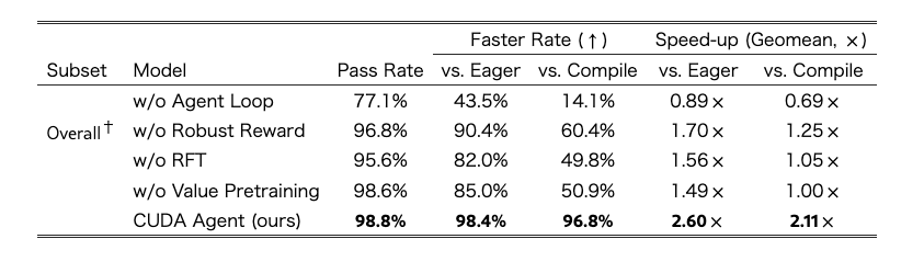 - w/o Value Pretraining: faster-than-compileが ≈50% まで落ちる → critic初期化も本質