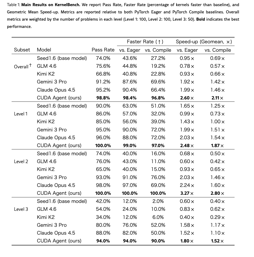 今週のTOPIC[paper] Multimodal OCR: Parse Anything from Documents[slide] Synthetic Data Powering Pretraining[paper] LookaheadKV: Fast and Accurate KV Cache Eviction by Glimpsing into the Future without Generation[paper] Flash-KMeans: Fast and Memory-Efficient Exact K-Means[paper] HiSem-RAG: A Hierarchical Semantic-Driven Retrieval-Augmented Generation Method[Blog/Paper] Systematic debugging for AI agents: Introducing the AgentRx framework[paper]UP TO 36X SPEEDUP: MASK-BASED PARALLEL INFERENCE PARADIGM FOR KEY INFORMATION EXTRACTION IN MLLMS[blog] Optimizing Recommendation Systems with JDK’s Vector APIHoge[paper]OpenClaw-RL: Train Any Agent Simply by TalkingHogeメインTOPICCUDA Agent: Large-Scale Agentic RL for High-Performance CUDA Kernel Generation概要背景と動機GPU最適化はLLMには難しい課題torch.compileをベースラインとするKernelBench?既存手法の課題RLの対象?手法Data Synthesis(訓練問題の合成)Agent Loop(SKILL.md+Harness)OpenHands + ReAct + Agent Skills でAgenticループを回すStable RLの設計2) なぜ必要か3) Step 0: Single-turn PPO warm-up4) Step 1: Actor 初期化 = RFT5) Step 2: Critic 初期化 = Value pretraining6) Step 3: Full Multi-Turn PPO実験結果(KernelBench)Main Results: Table 1Table 2:各手法ごとの性能Training Dynamics: Figure 4 & 5Case StudyLevel2に強い理由?考察と限界強み限界感想参考資料Seed1.6について