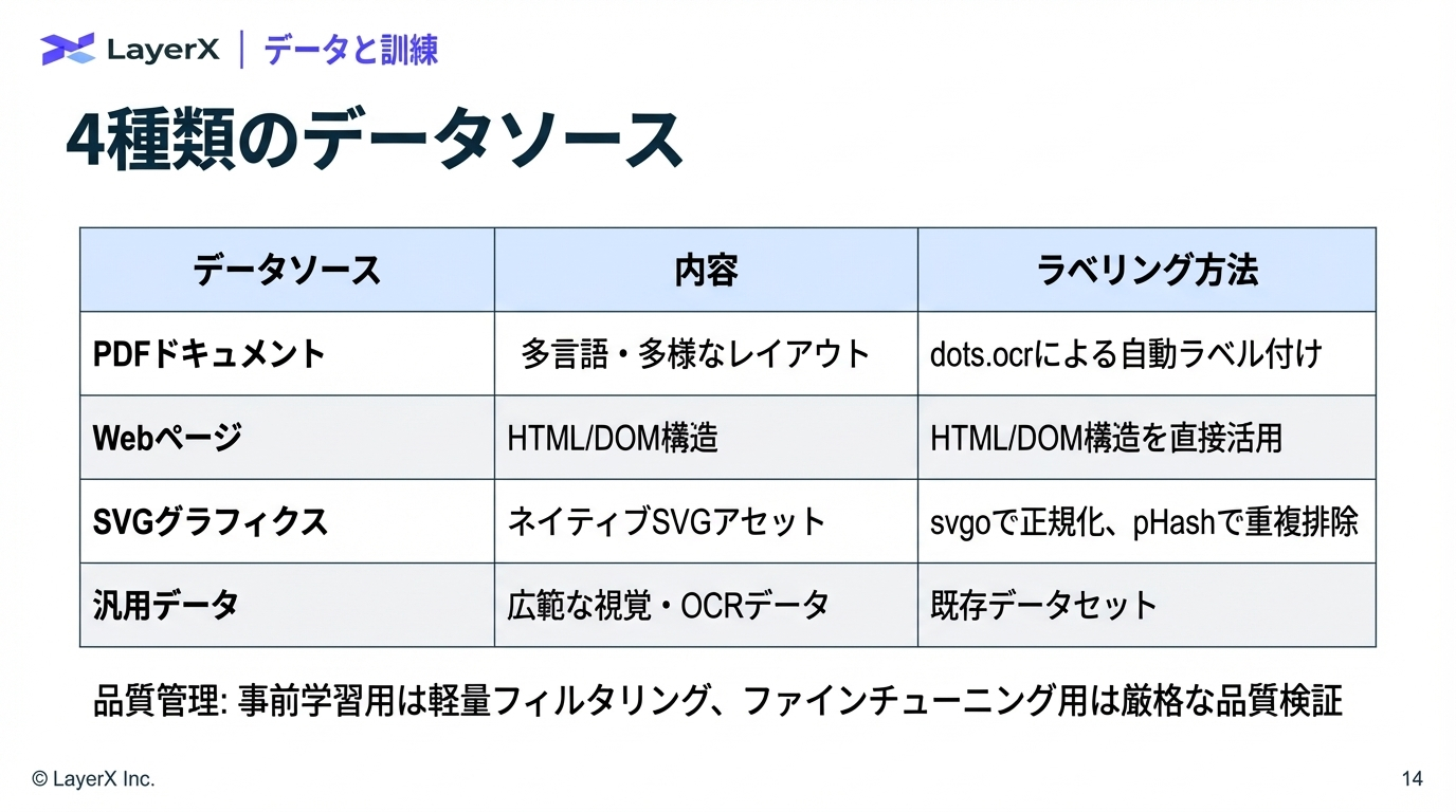 - プログラムコード: Pythonで書かれたコードをC++に変換させるなどして言語間の構造を学習させる。コードは実際に実行して正しいか検証できるという強みがある。