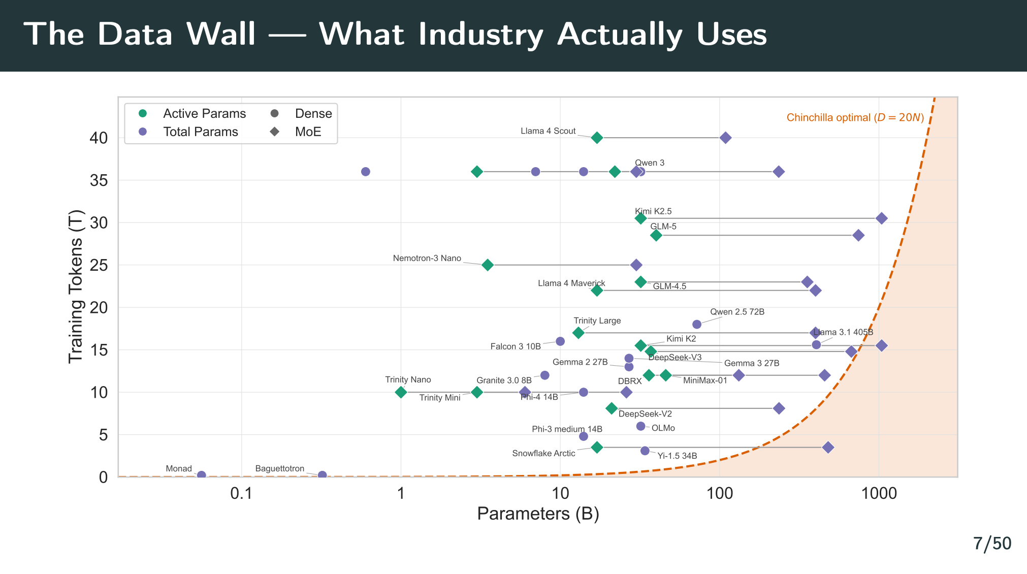 特に、昨今主流となりつつあるMoEというモデル構造はより多くのデータを必要としている。スケーリング則によると、Denseモデルでパラメタ数の20倍ほどと言われるが、MeEであれば40倍程度とも。