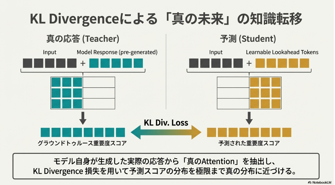 - 「実際に生成されたトークンによる過去トークンの重要度」と「Lookahead Tokensによる過去トークンの重要度」とが近くなるように学習