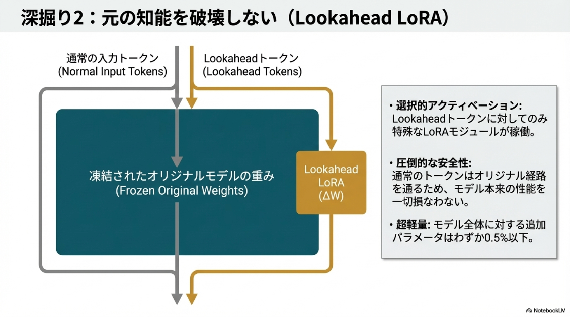 - LoRAアダプタを付与し、Lookahead Tokensに関わる部分で利用する