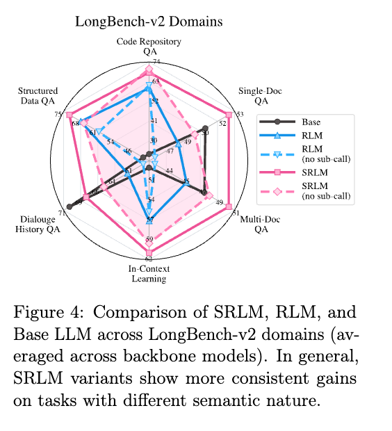 SRLMは、既存のベースラインおよびRLMを一貫して凌駕している。