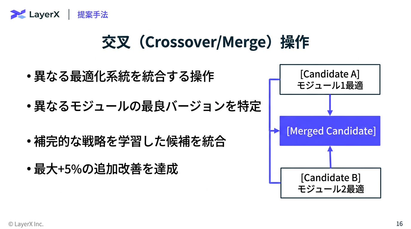 - 反射的変異 (Reflective Mutaion) or 交叉 / マージ (CrossOver / Merge)のどちらで候補を生成するかを選択