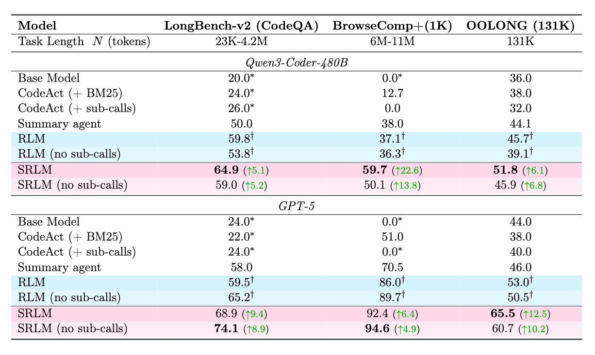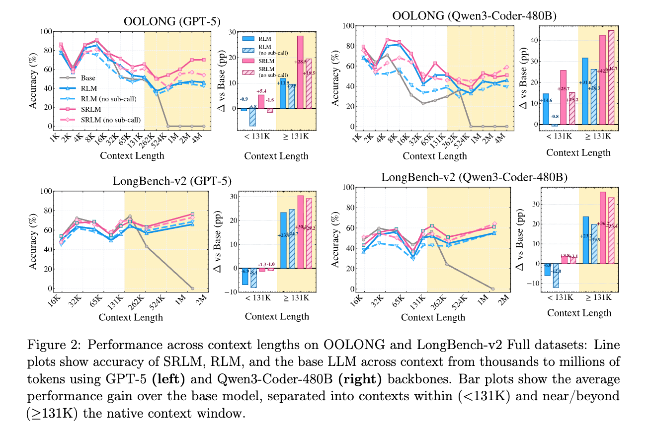 - 短文コンテキスト: RLMはコンテキストウィンドウ内(<131K)であっても、再帰的な分解によってベースモデルより性能が低下する場合がある。一方、SRLMは短文から長文まで安定してベースモデルを上回る。