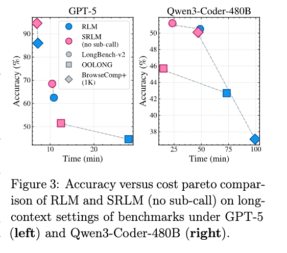 - 知見: 再帰メカニズム(自己クエリの呼び出し)を無効化したSRLMであっても、再帰を使用するRLMと同等以上の性能を発揮する。