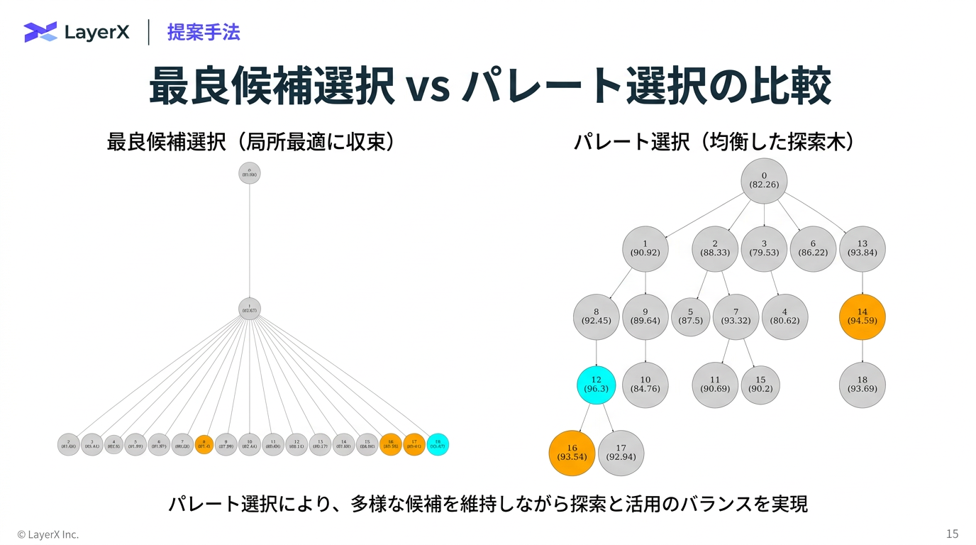 統合スコアの算出: 一貫性のある候補セットの中で、 の計算を行い、不確実性が最も低い(自信が高く、かつ簡潔で迷いのない)プログラムを最適解(p∗)として選択する。