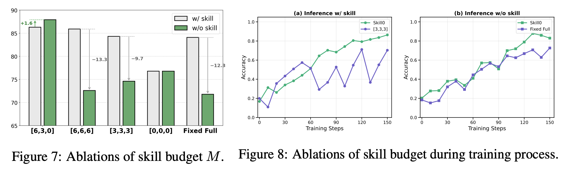 - skill budget を固定で多く保つ設定は、訓練中は高く見えても、推論時に skill を外した瞬間に大きく性能低下する。逆に、最初から少なすぎる skill budget は、初期探索を妨げ、学習を不安定にする。