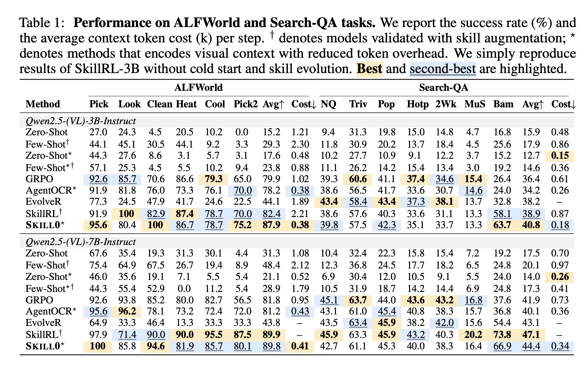 - 比較対象は zero-shot、few-shot、GRPO、AgentOCR、EvolveR、SkillRL などである。