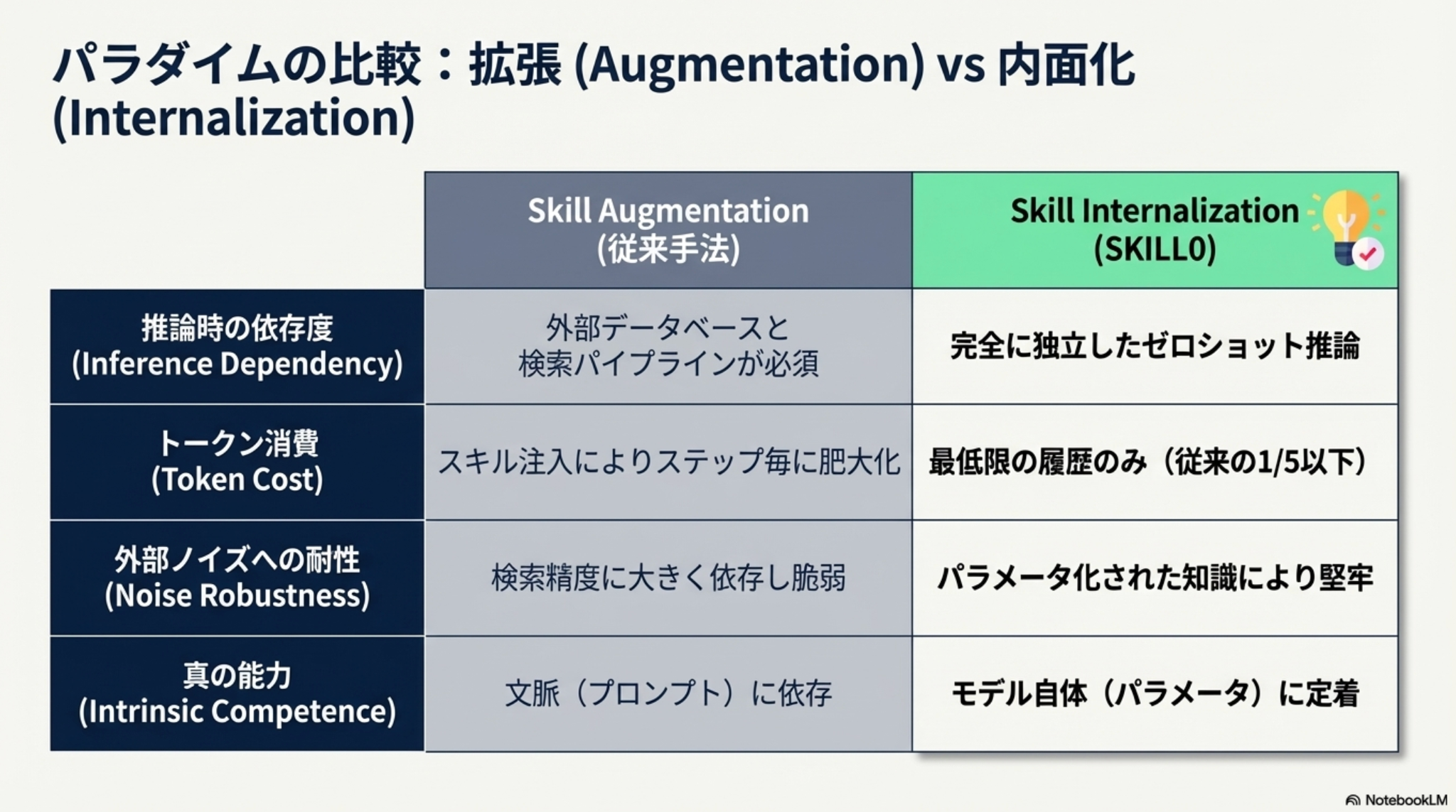 - 人間が最初は手順を見て行動し、後から自動化できるようになるのと同様に、LLM agent もスキルを最終的に内在化した方が良い?