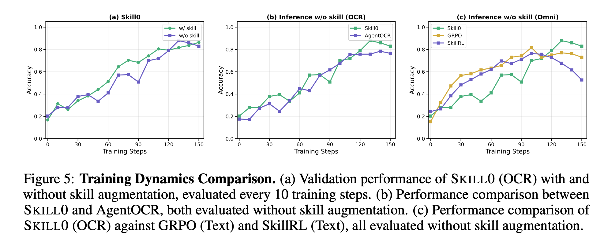 - GRPO や SkillRL は比較的早く頭打ちになる一方で、SKILL0 は後半まで性能改善が続く傾向