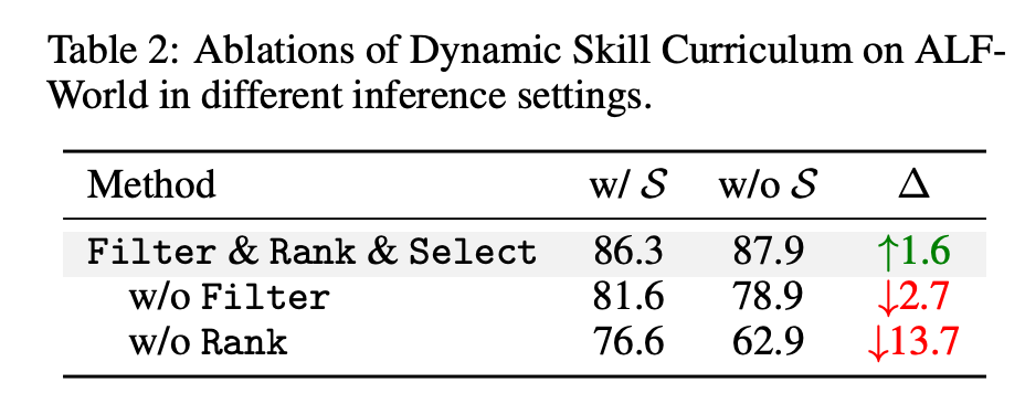 - w/o Rank では、残すべき skill の優先順位付けが崩れ、さらに大きな性能崩壊が起きる。