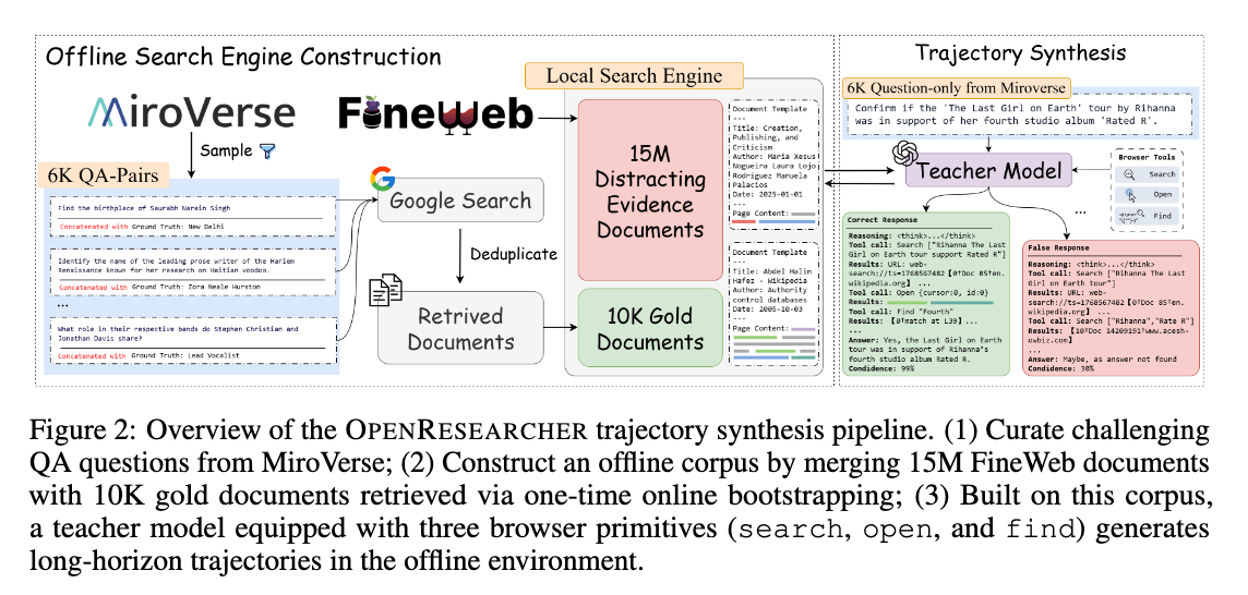 - オフライン検索エンジンの構築: 軌跡の再現性を確保するために、関連する証拠が常に検索可能である必要があります。このため、質問と参照回答を連結した検索クエリを用いてSerper API経由でWebコンテンツを検索し、クリーニングと重複排除を経て10Kのゴールドドキュメントを抽出します。