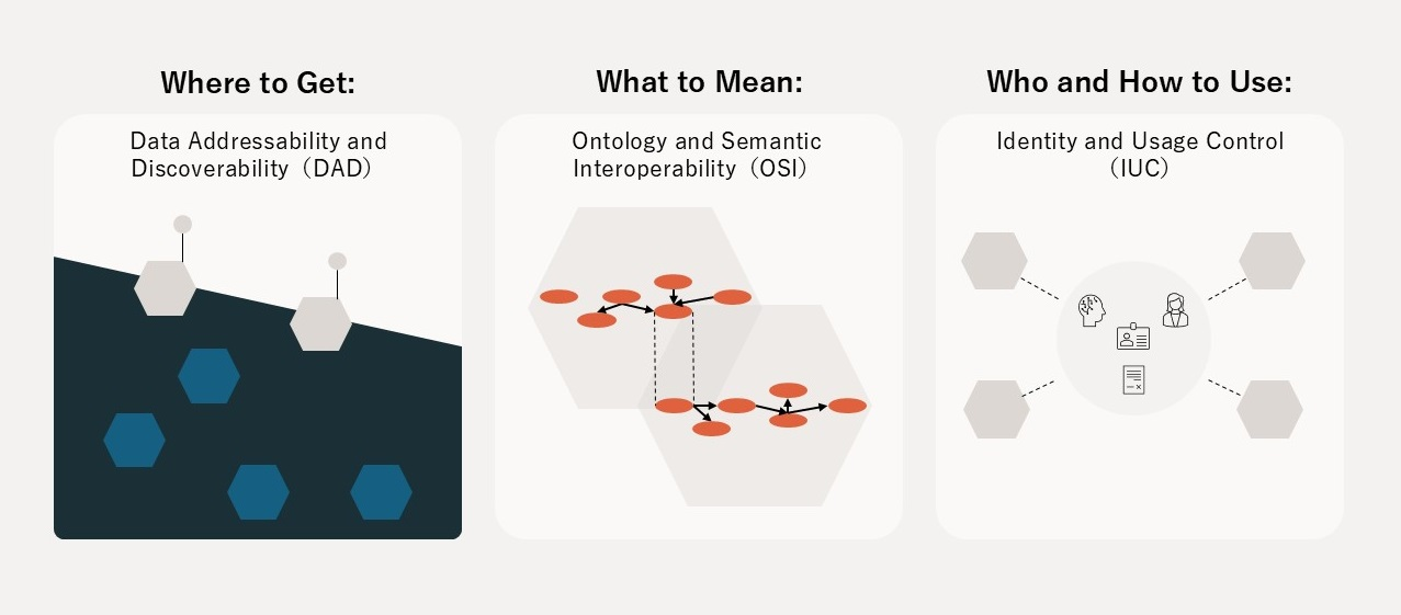 3つの柱は独立して機能するのではなく、相互に連動して初めてOpen Dataspacesの全体機能が成立する。