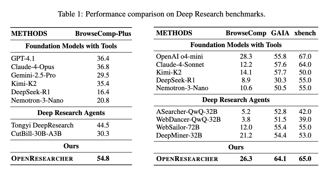 - OPENRESEARCHER-30B-A3Bは54.8%の精度を達成し、GPT-4.1 (36.4%)やClaude-4-Opus (36.8%)などの強力なプロプライエタリベースラインを大幅に上回りました。これは、ベースモデル(Nemotron-3-Nano-30B-A3B)に対する+34.0ポイントの絶対的改善を示しています。