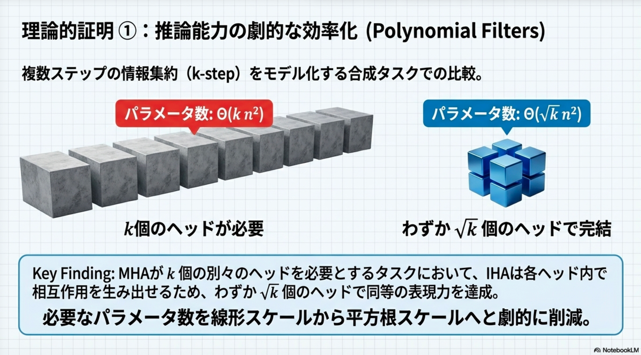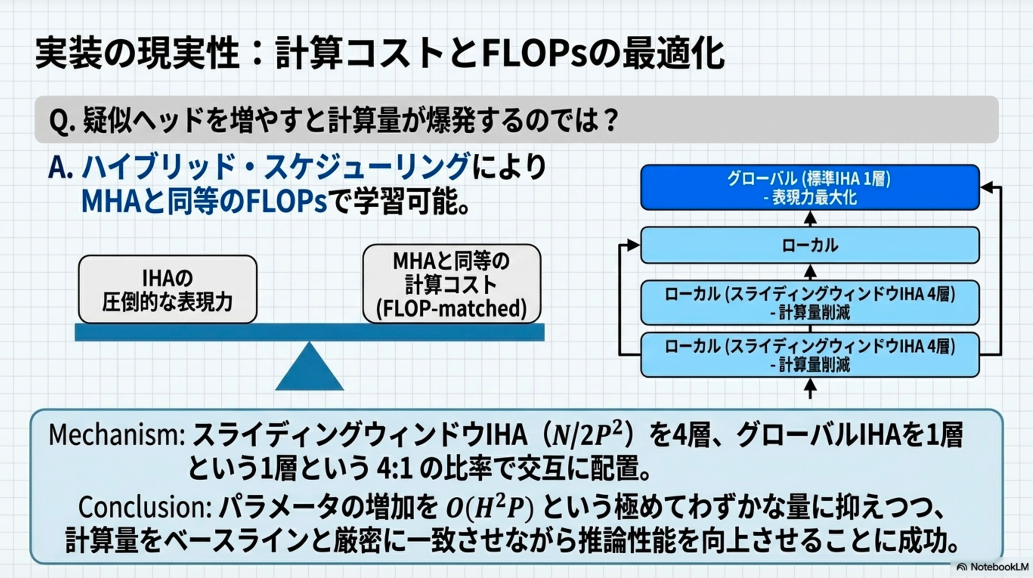 - IHA: わずか パラメータで同等の表現力を達成。 この への効率化は、IHAが H 個のクエリ行列と H 個のキー行列のペアワイズな相互作用(パターン)を利用して、関係性を因数分解(Factorization)できることに起因する。